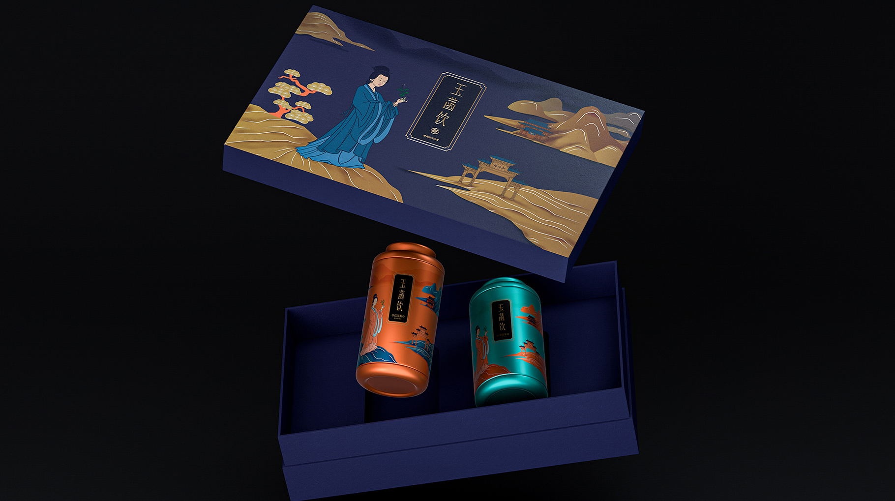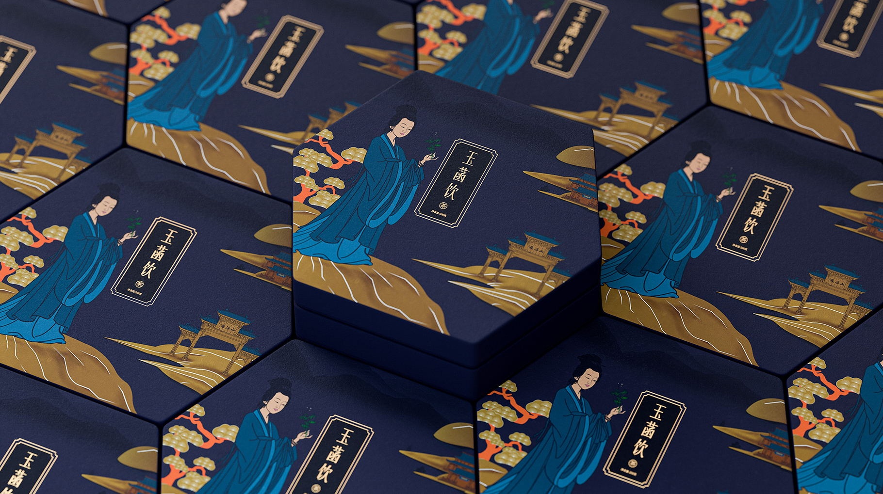 玉函飲是廣東暨晴生物醫藥科技公司旗下推出高端養生茶葉產業品牌,以東莞羅浮山原種紅腳艾含有豐富的鋅等天然元素作為主原料結合桑骨茶和搭配出符合東方女性養生的美容茶,口感酸甜,非常適合女性消費者,整體品牌包裝以東莞羅浮山作為創作背景,結合東莞羅浮山的道教圣地文化,同時將東晉第一位女神醫“鮑菇”之經典形象作為主符號,結合羅浮山的自然風情,以現代文雅的表現手法進行創作,整體包裝具有東方文化之精髓,同時傳遞當下人們對純樸自然風情的生活方式向往。