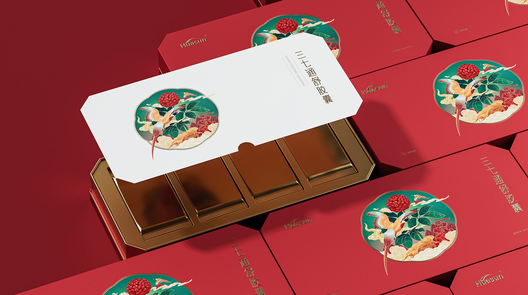 本次同道受成都華神科技集團股份有限公司委托進行三七通舒膠囊禮盒產品包裝設計,本案合作核心的目的是改變消費者對三七通舒膠囊傳統中藥的印象,讓中醫養生文化更好融入大眾生活,并更好的為讓消費者理解三七中藥品牌的文化及價值認知。